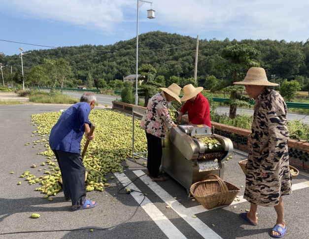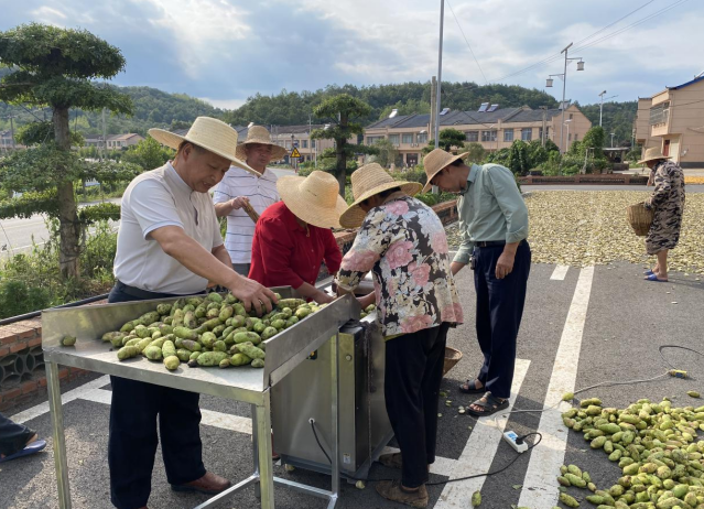 加工環節兼顧傳統篩選與現代效率。村民們圍在竹筐旁,麻利挑出帶蟲眼、有磕碰的青果,只留下飽滿周正的果實——這些符合標準的青果將按比例進行加工。隨后,村民肖大叔啟動切片機,“嗡嗡”聲中,厚度精準達半厘米的果片滑入竹筐?!叭ツ耆斯で衅惶祉敹嗵幚?00斤,現在三臺機器半小時就能切500公斤,還省了6個人工!”肖大叔擦著機器笑道。據測算,機器作業效率較去年提升3倍以上。