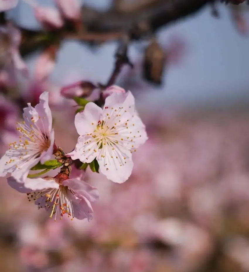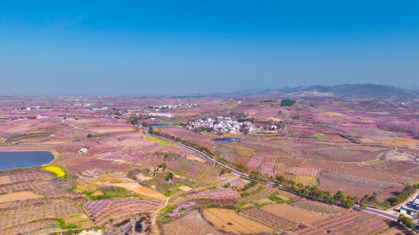 不論是遠眺還是近觀,無需刻意而為,粉白相間的俏麗嫵媚,與青山、村莊相映成趣,花美,景更美。