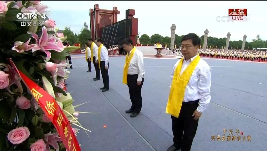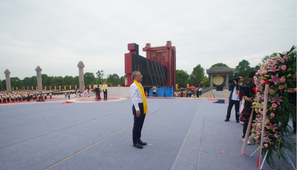 歲次甲辰,時在孟夏。九州太平,四海清嘉。華祖門前,排仗迎迓,行禮如儀,恭迎海內外炎黃子孫謁祖尋根。在炎帝神農故里照壁處,嘉賓們整理衣冠,佩戴黃絲巾,在幡旗方陣和奉祀方陣的引導下,經過四牛耕作石雕、九拱橋、華夏始祖門、圣火臺、七步登天臺,行至莊嚴肅穆的謁祖廣場,面向炎帝神農大殿肅立。