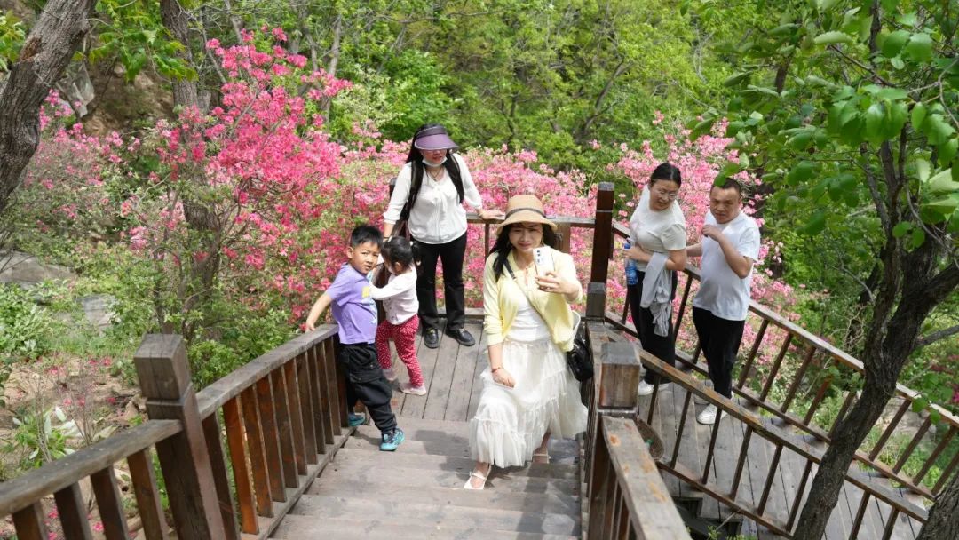 漫步在蜿蜒的步道上,兩側杜鵑花熱烈綻放,如跳動的火焰,絢麗奪目。游客穿梭于花海,或駐足細品,或舉鏡記錄,定格美好的瞬間?!敖裉焯鞖夂芎?,帶孩子來田王寨景區聽紅軍故事,看杜鵑花,又給孩子上了一堂生動的紅色教育課?!币幻麃碜砸蟮赕偟挠慰透锌?。