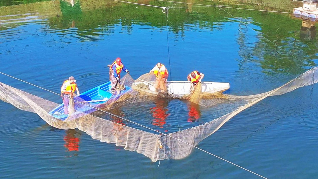 “起魚啰……”一大早,隨著捕魚人一聲吆喝,村民們拿著板凳陸續來到集體魚塘,開心地等待著撒網起魚。 當漁網行進到魚塘中間時,由于空間不斷縮小,不時有草魚、鰱魚相繼跳出水面,發出此起彼伏的拍水聲。